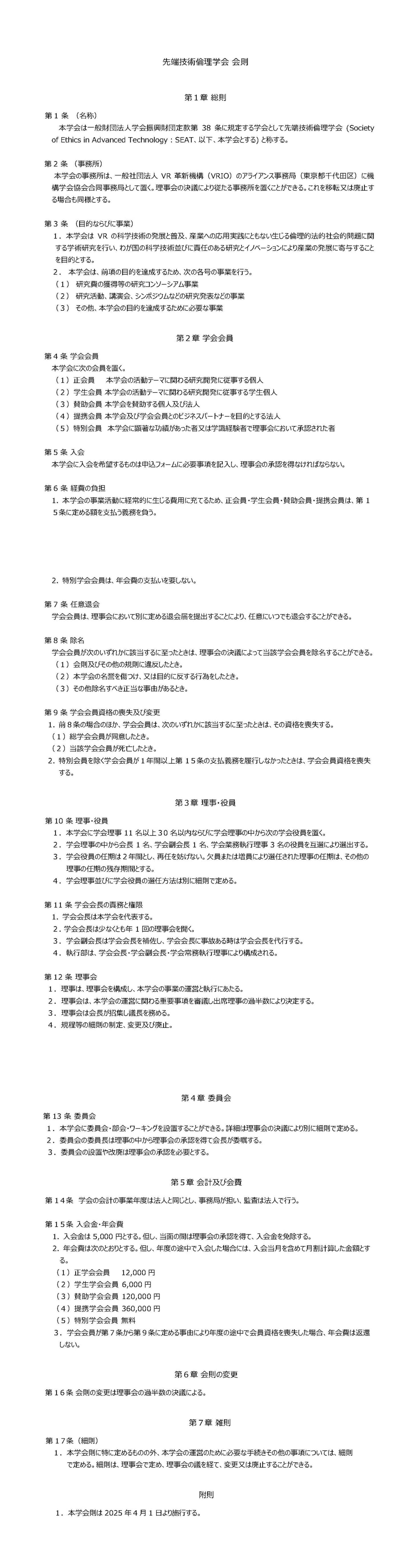 このような状況に対応していくために、学会活動のターゲットをVRのみならずAIその他の先端科学技術に広げ、2025年4月より学会名称を「先端技術倫理学会」に変更することになりました。学会が新たに生まれ変わるにあたり、AIの問題に精通し一線で活躍している著名な研究者数名を新たに理事に迎え、学会運営のさらなる推進と学会活動の強化を図ることとなりました。